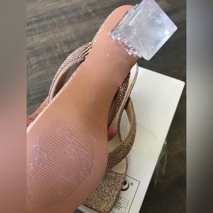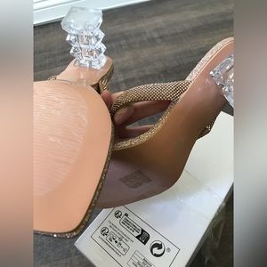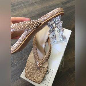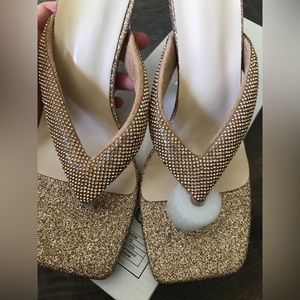 Glamorous GOLD Rhinestone Toe Post Design Sculptural Heeled Thong Heels
