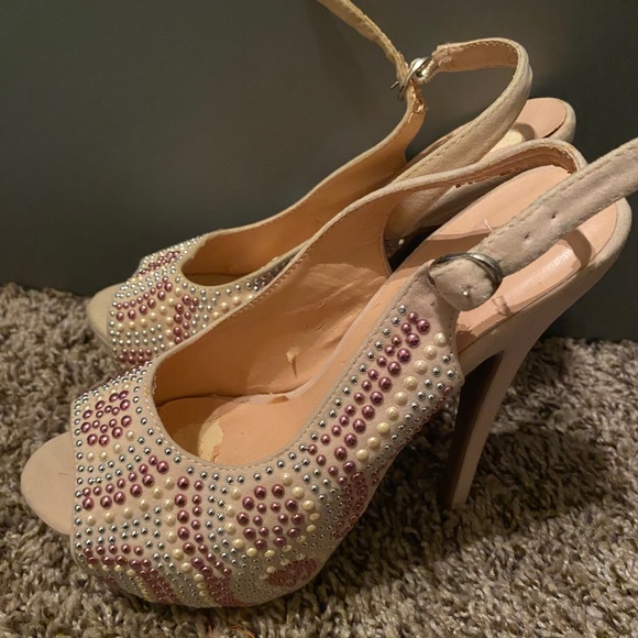 Shoes never worn . They’ve just been hanging out in the closet. There is some peeling and discoloration inside the shoes and around the strap.