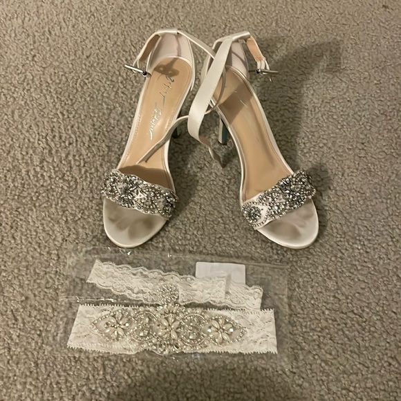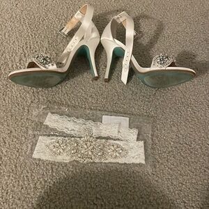 Betsy Johnson rhinestone ivory heels and wedding garter set. Heels worn once for wedding and garter set brand new never used.