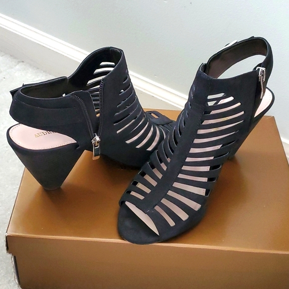 Audrey Brooke leather upper black suede sandals with zipper and buckles size 9.5.