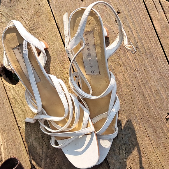 size 7.5 Bandolino small dress heels. white with ankle buckle open toe sandals.