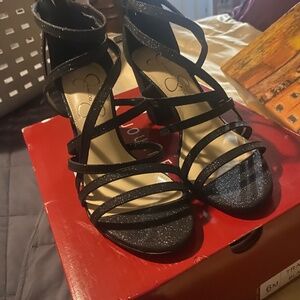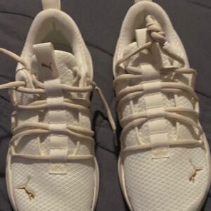 2 pairs of black size 6 Jessica simpsons heels and white/gold puma 6 1/2 tennis shoes