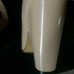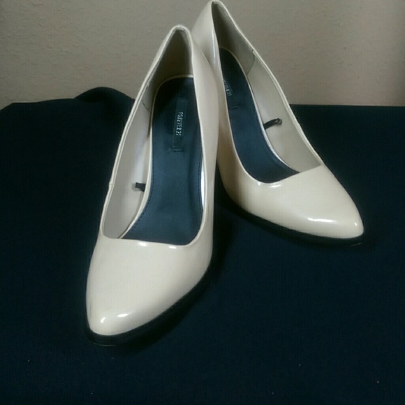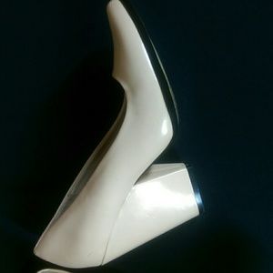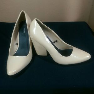 Cream forever 21 pump. The heel is a chunky 4 inch heel. The shoe is comfortable and can be a business shoe or an out on the town pump. The shoe is gently used with a few love marks that I have pointed out in the pictures.