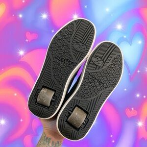 Classic Heelys with a sleek black design. Features white accents for a bold look. Ideal for skating enthusiasts. Comes with the tool to pop the wheels out:) unfortunately I don’t have the cover for the bottom after you take the wheels off.