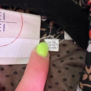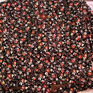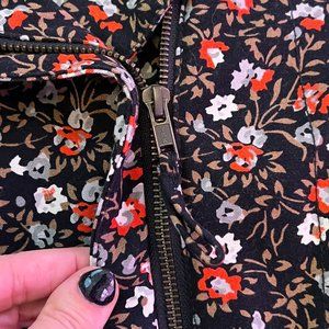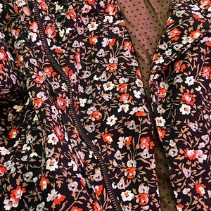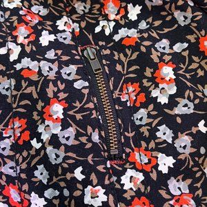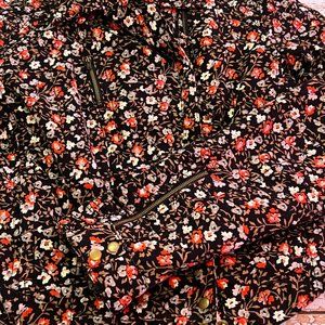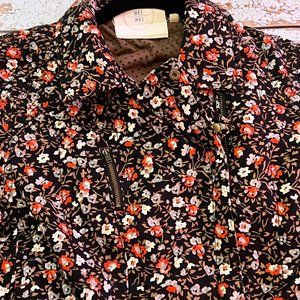Moto style jacket in cotton and burnt orange, white and grey floral pattern with tan accents. Black background. Cute dressed up or with jeans for a casual look. Zipper accent on sleeves and breast pocket. Bottom snaps.