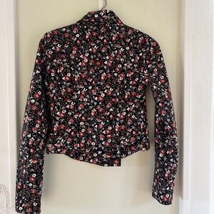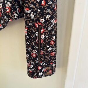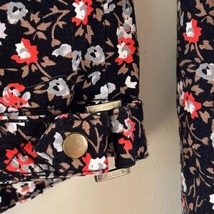 Black with coral, white, and gray flowers, cropped moto jacket. Asymmetrical zip closure. Adjustable waist buckle with two snaps. Side zip pockets and a front zip pocket. Zipper and two snap closure on the sleeves. Fully lined polka dot light weight interior. Lining shows slight pilling, otherwise in good pre-owned condition.