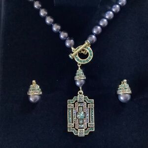 Featuring a stunning Art Deco-inspired pave pendant with matching earrings and ring.
