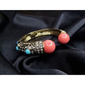 The bracelet is beautifully accented with turquoise cabochons and coral-colored enamel orbs at each end, creating a striking contrast that radiates sophistication and warmth.