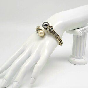 The necklace wraps all the way around the neck in a comfortable rigid collar design. At the back is a hinge that makes putting the piece on a breeze. At the front are two glass pearl drops, one black and one white, that are capped with sparkling crystal flowers in the shade of clear diamonds and hematite. This piece is so detailed that even the sides of the metal have been textured in a ribbed pattern so that it is stunning from absolutely every single angle.