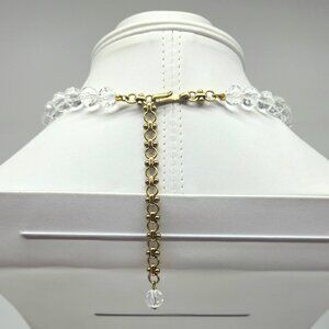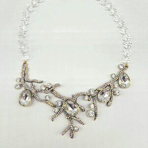 Necklace: Clear crystals cascade down the neck to a COMPLETELY SWAROVSKI CRYSTAL ENCRUSTED branching coral collar! A mixture of pear and round cut aurora borealis stones create a stunning variety of light reflection and color. If you are not familiar with Aurora Borealis, the stone shifts colors from clear to pink to gold to purple to green. The details are impeccable from the sculpting of the bronze tone metal to the individually knotted crystal strands to the HANDSETTING of each stone. Extendable from 16"L-20"L. Designer Signed.
