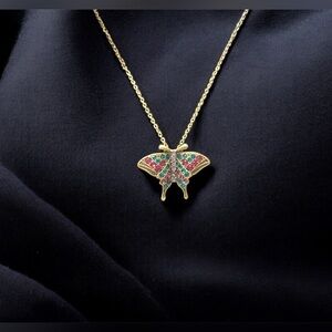 Elegant gold butterfly pendant necklace featuring vibrant pink and green accents. Perfect for adding a touch of whimsy to any outfit. Signed.