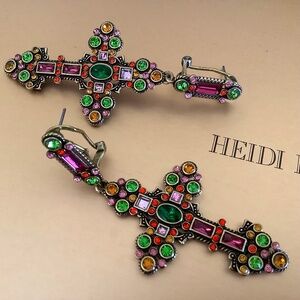Heidi Daus "Cross My Heart" Crystal Cross Dangle Earrings Omega Backs for pierced only Pink Multi