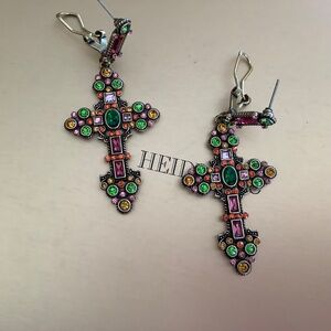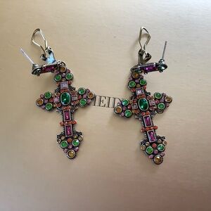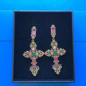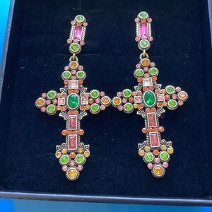 Heidi Daus "Cross My Heart" Crystal Cross Dangle Earrings Pierced Pink Multi