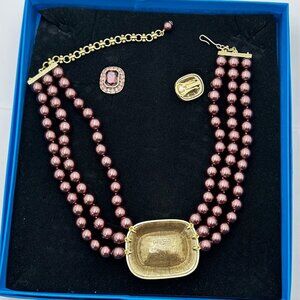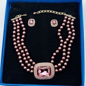 Heidi Daus Dark Pink Crystal Bronze Tone Necklace Clip Earrings 16 to 20 Inch in