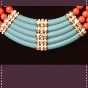 Heidi Daus Deco Dazzle necklace. A classic necklace is one of Heidi Daus's collector pieces, with Swarovski crystals. This set speaks for itself, from the red colored beads to the beautiful turquoise blue pendant uniquely laced with Swarovski stones. The picture is zero in comparison to these beautiful masterpieces. Pendants measurement length 43/4 long and 11/2"width. .Heidi's limited lifetime warranty
