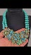 Bold, bib-style drop features a cluster of flower designs adorned with multi-sized, multi-shaped crystals.  Turquoise colored round beads lead to flower clusters of various shades of blue , turquoise,  along with clear stones.  Stunning!