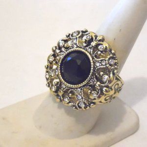 Heidi Daus Jet-Color "How Suite It Is" Crystal Ring Size 8. Design Information: Bold medallion-design table features a large glass stone center in milgrained bezel setting; Crystal-adorned, open swirling metalwork frame. Wide shoulders and tapered shank adorned with textured patterns; Measurements: Approx, 1-1/8L x 1-1/8"W. x 3/8"H shank 1/4"W; Metal Color: Bronzetone; Finish. Oxidized, textured; Imported. Warranty: Manufacturer's lifetime limited. Color Information: Jet-Color includes clear crystals and a black glass stone.