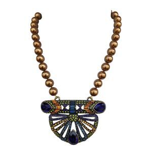 Heidi Daus RARE Gold Pearl Necklace Large Colored Rhinestone Medallion Adjustable