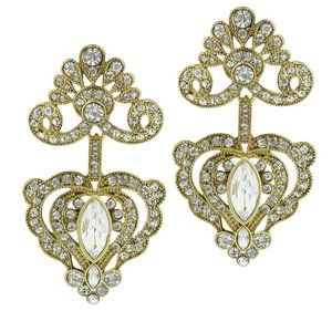 A sumptuously designed upper station fitted with brilliant cut diamond crystals and pavé supports a lower drop station with curved rows of diamond crystal and pavé with a marquis cut diamond crystal