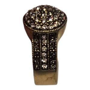 Heidi Daus round crystal and brass wide band ring. Features clear and gray pave set Swarovski crystals in round setting and on sides of band. Excellent used condition. Size 8.5