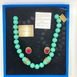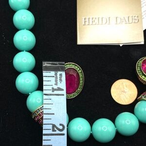 Heidi Daus signed turquoise and Swarovski crystal necklace and pierced earrings set new in original box. Chunky turquoise color beads are knotted in between and there are two criss cross rings of multi color Swarovski crystals accenting the piece. The beaded portion measures 16" and there is 4" of extender with hook closure for adjustability. The large oval earrings match the crystal accents of the necklace with deep rose pink centers surrounded by green crystals. Omega style backs. The tag is still attached to the necklace. This set comes in its original box.