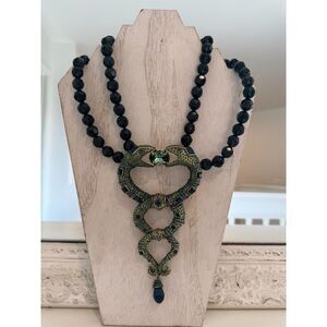 Exquisite double strand necklace featuring a gorgeous crystal intwined snake pendant signed Heidi Daus. The closure is a hook and the necklace length is adjustable 18" - 22.5" . The serpent/snake pendant piece measure 6 1/4" front the top of the bottom of dangling crystal.