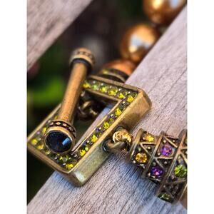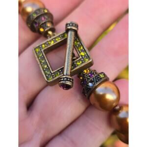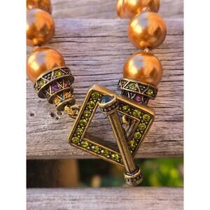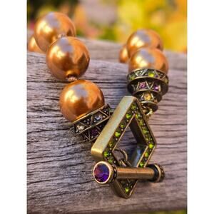 Featuring a gorgeous strand of bronze tone pearls with a square and bar crystal encrusted toggle, (bar features a garnet colored crystal one one end and a dark sapphire colored crystal on the other, see photos). This gorgeous multi colored crystal enhanced toggle bracelet by Heidi Daus will not disappoint!