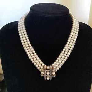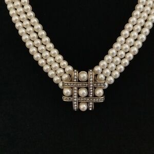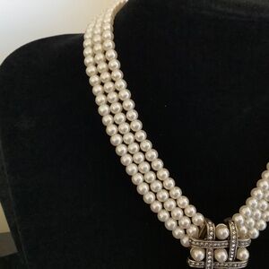 Elegant simulated three strands of faux white pearl beads with Swarovski crystals