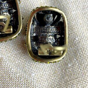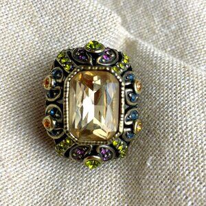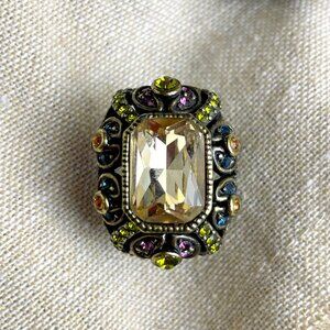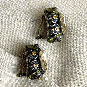 Heidi Daus chunky multicolor crystal statement earrings. One large light smoky topaz crystal surrounded by olivine, purple, amber and blue accent crystals. Post pierced, signed. Made for HSN.