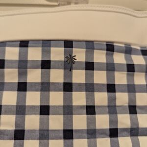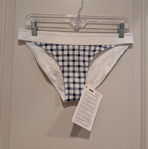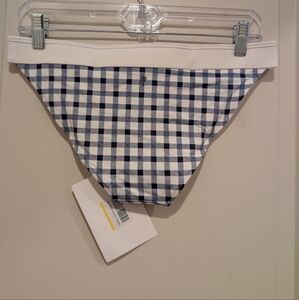 Stylish bikini bottoms with a blue and white checkered pattern. Perfect for a beach day.