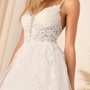 Lulus Height of Love White Embroidered Beaded Backless A-Line Gown! Floaty tulle shapes this elegant dress that has slender spaghetti straps and a sexy open back. Semi-sheer bodice has floral embroidery (with sequin and bead accents) across the surface, with supportive padding and a plunging neckline. High, fitted waist carries into an A-line, ballgown-like skirt with airy layers of embroidered tulle, and hidden additional layers for volume. Hidden zipper/clasp at back.