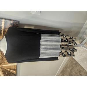 Featuring a trendy three-tiered design, the top section is crafted from soft black fabric, light gray middle tier and finished with leopard print. This dress is not only fashionable but also comfortable, making it suitable for all-day wear. - Soft and breathable fabric - Unique color block design - Versatile for various occasions - 20 pit to pit but has plenty more stretch