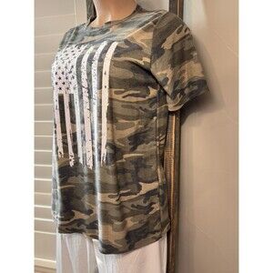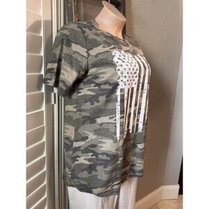 The Heimish U.S.A. Camouflage T-shirt With White Flag in 2XL is a stylish and comfortable short sleeve t-shirt made from a blend of polyester and spandex. The t-shirt features a V-neckline with crisscross straps, adding a unique accent to the design. The multicolor camouflage pattern with white flag accents gives it a patriotic and colorful theme, perfect for casual occasions during the summer and spring seasons. The regular fit and soft material make it a versatile and trendy addition to any woman's wardrobe.