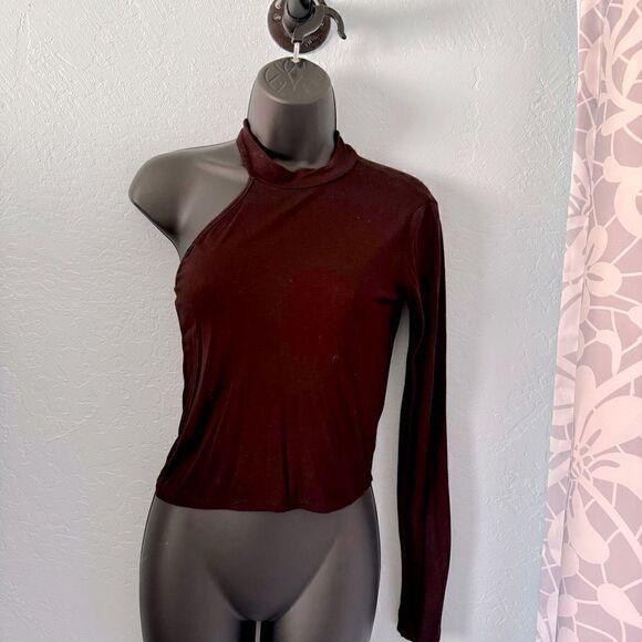 Heiny Collection Brown Mock Neck Cut Out One Shoulder Long Sleeve Shirt Sz Small