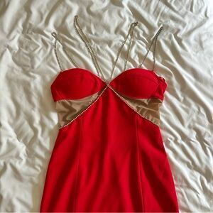 Stunning red mini dress with rhinestone straps and cutouts. Perfect for a night out, homecoming, prom, or formal event. Worn once! So so cute