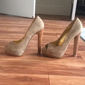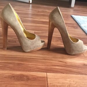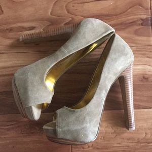 Size 6.5 Peep toe, taupe suede upper with a partially covered 1 inch stacked platform and a 5 1/2 inch heel. In great condition, like new. Worn once outside the house.