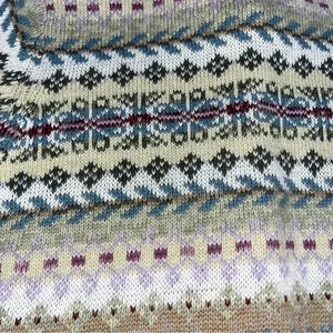 Description: beautiful colorway, fair isle cardigan design and pattern copyrighted 2003. Cool plastic buttons that resemble leather tufted buttons, well made