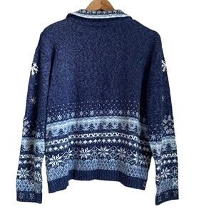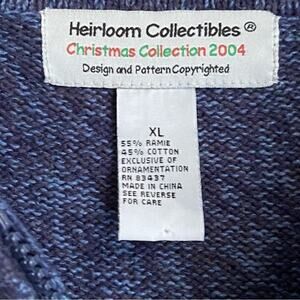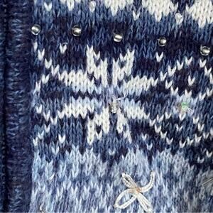 Festive Heirloom Collectibles Christmas Collection 2004 zip-up sweater jacket in navy blue with winter snowflake and Fair Isle designs. Features sequin and bead embellishments for extra sparkle, plus a snowflake zipper pull. Made with a soft ramie/cotton blend for cozy comfort. Perfect for holiday parties, ugly sweater contests, or winter wear.