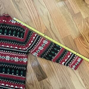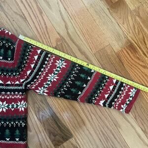 Festive and cozy, this Heirloom Collectibles Christmas cardigan features a classic Fair Isle pattern with trees and snowflakes in rich red, green, and white tones. Designed with a full zip front and front pockets, this soft knit sweater offers warmth and holiday charm. Slightly faded from wear, adding to its vintage-inspired character. Perfect for Christmas parties, casual winter outfits, or cozy nights by the fire.
