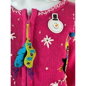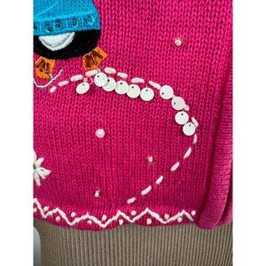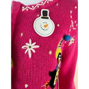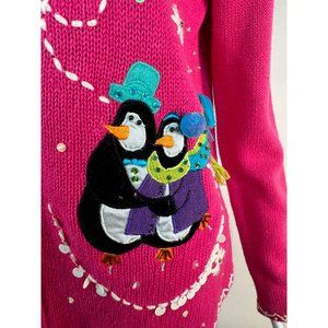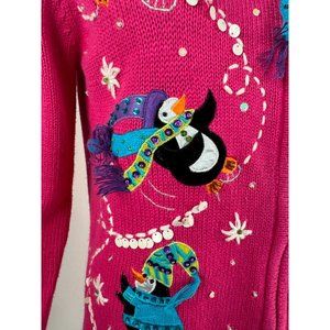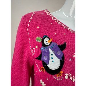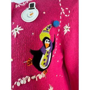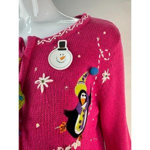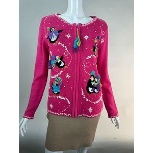 Heirloom Collectibles Petite Lg XMas Penguin Zip Cardigan Sweater Pink Cotton Bl