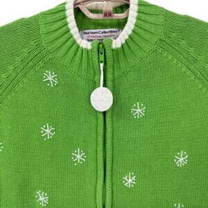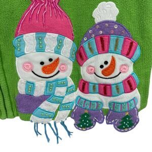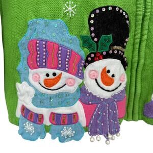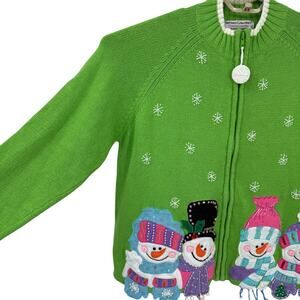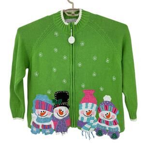 Fun bright green knit zip up cardigan sweater. On the front is snowman with funny hats. One snowman has bells and all are embroidered with beads and sequins. Beaded snowflakes throughout and another snowman on the back. It's a size 18/20 in excellent used condition. There may be a bead missing here in there but nothing major. Laid flat it measures approximately 23 inches armpit armpit and the length from the top of the shoulder down the back