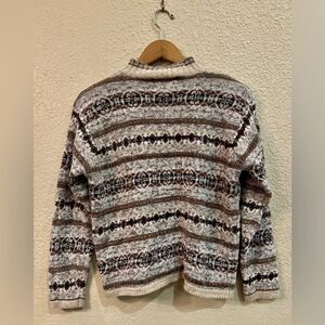The perfect neutral cardigan to add to your fall wardrobe. Zips all the way up. Tight knit weave. Shades of brown and tan. No size tag but measures as a M-L. See pictures for me.