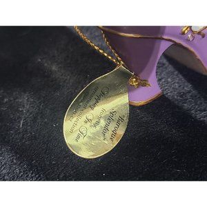 Gorgeous purple and gold resin shoe ornament with tag. The attention to detail is great. Even the heel has gold ornate details. The plastic gemstone is iridescent, real lace trim.