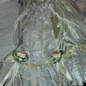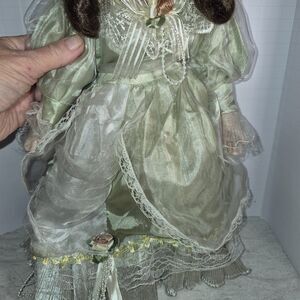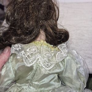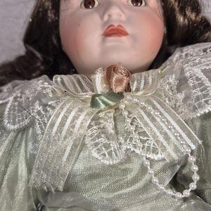 Heirloom Treasure Doll, Dark Long Curley Hair with Green Dress and Bow on Front
