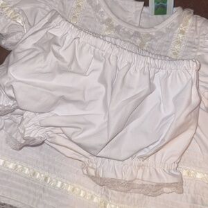 The sweetest white lace heirloom diaper set. Size 9 months BNWT. Paid $50 and just never got a chance to wear it. The detail on this is beautiful.
