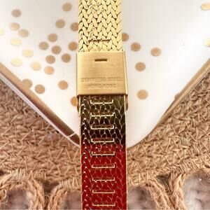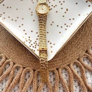 From Helbros. Style number 224-Y112. Gold plated nugget texture band round face watch with diamond chip detail. Stainless steel back and base metal bezel. Needs new battery. Does have a small dark section above face that I have not tried to correct. See photos for more details. Preowned.