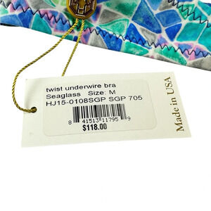 The Helen Jon Women's Seaglass Twist Underwire Bra in size Medium features a geometric multicolor pattern with spaghetti straps and underwired support. Made from 82% Nylon and 18% Spandex, this swim top includes removable straps and a stylish twist accent. The brand, Helen Jon, is known for its sea glass theme and high-quality swimwear, manufactured in the United States. Ideal for women looking for a comfortable and fashionable swim top with added support for a day at the beach or pool.