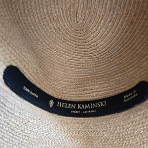 Helen Kaminski hat, crafted from 100% raffia. It features a wide brim and a decorative black ribbon tied in a bow. The hat is a natural tan color. Made in Australia. Measures approximately 17" diameter, head opening measures approximately 7.5" with a head circumference of approx 23". Perfect for a day in the sun or the beach!