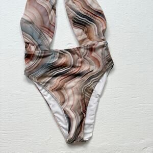 sleek and modern one piece swimsuit in a marble swirl print. features a deep plunge halter neckline with adjustable tie, high-cut legs, cheeky coverage, and removable padding for added comfort. made with recycled nylon blend for a flattering stretch fit, perfect for poolside lounging or beach getaways.