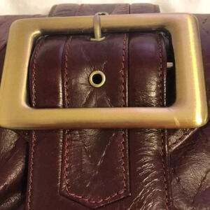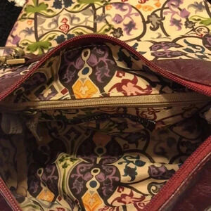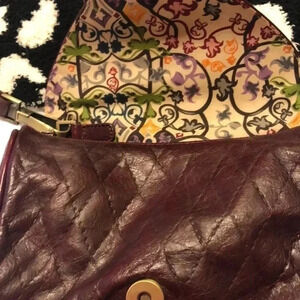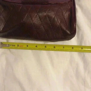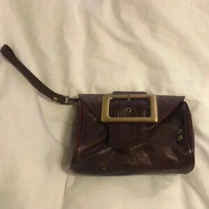 Helen Welsh leather clutch with detachable strap. Measurements are 7-1/2” across x 5-1/2” in height. Main compartment is snap shut and there is one internal zippered pocket. It’s a beautiful burgundy color with a nice floral design inside.